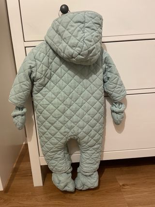 Buzo acolchado de la marca Coconut. - Talla 6-9 meses (74cm). - Color verde menta. - Diseño acolchado con rombos. - Capucha. - Cierre de botones. - Incluye manoplas y patucos. - Bolsillos delanteros.