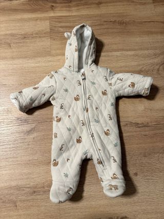 Buzo acolchado para bebé, ideal para los primeros meses. Presenta un adorable estampado de animales del bosque y hojas. - Diseño con capucha y orejitas. - Cierre frontal con cremallera. - Pies cubiertos. - Tejido suave y cálido. - SOLO USADO 1 DIA, es precioso. newborn