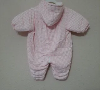 Precioso buzo acolchado en color rosa para bebé. - Talla 3 meses. - Diseño acolchado con rombos. - Incluye capucha y manoplas. - Cierre de botones a presión.