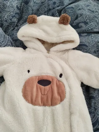 Precioso buzo de bebé con diseño de oso, perfecto para mantener a tu pequeño abrigado. - Material suave de borreguillo. - Talla 0-3 meses. - Capucha con orejitas. - Detalle de bolsillo con un pequeño oso. - Pies incorporados con pompones.