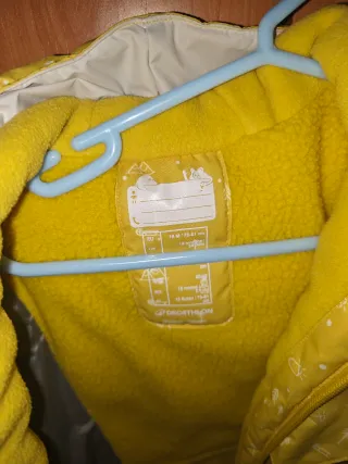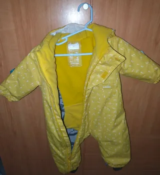 Buzo de nieve amarillo para bebé de la marca Wedze, ideal para el frío. - Talla 18 meses (76-81 cm). - Estampado de motivos blancos. - Forro interior de borreguito amarillo.