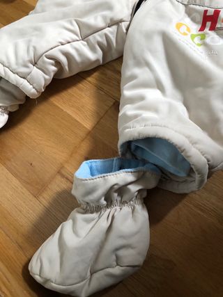 Abrigo buzo de bebé impermeable y forrado interior muy calentito. Incluye capucha, guantes y botas. Ideal para que tu bebé vaya calentito en mochila de porteo. En perfecto estado. Marca Chicco. Talla 9 meses