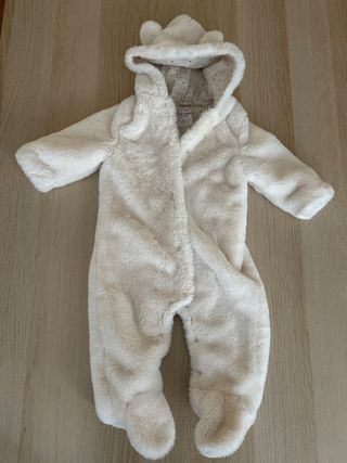 Buzo de peluche para bebé de Zara, ideal para mantenerlos abrigados y cómodos. - Diseño suave y tierno. - Cierre frontal mediante corchetes, también se abre entre las piernas para facilitar el cambio de pañal. - Capucha con orejitas. - Talla 3-6 meses / 68 cm. - En perfecto estado, muy poco uso.