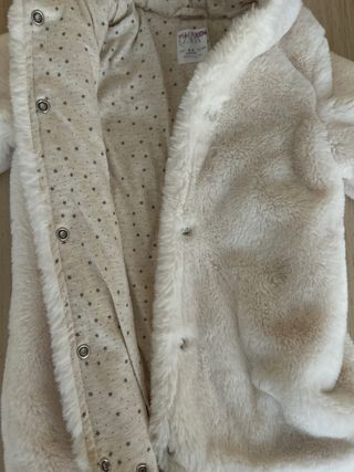 Abrigo tipo buzo para bebé, muy suave y calentito. - Material exterior de pelo sintético. - Forro interior de algodón con estampado. - Cierre de botones. - Capucha con borde de pelo. De Zara