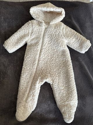Buzo de borreguito polar para bebé, muy calentito. Talla 0-1 de ZARA (56 cm). - Material exterior: borreguito. - Cierre de cremallera frontal. - Capucha integrada. - Pies cubiertos.