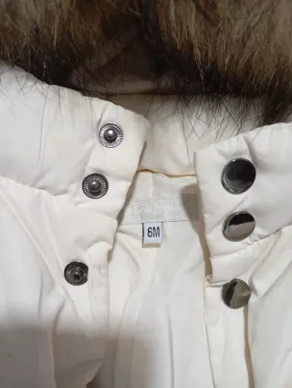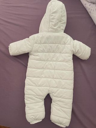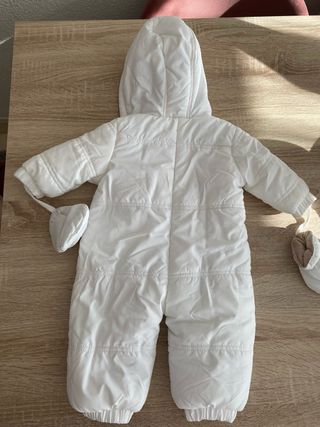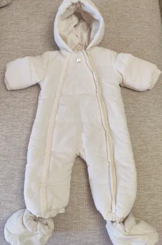 Buzo de invierno para bebé de 6 meses. Perfecto para mantener al pequeño abrigado en los días fríos. - Color blanco roto. - Capucha con pelo. - Incluye manoplas a juego.