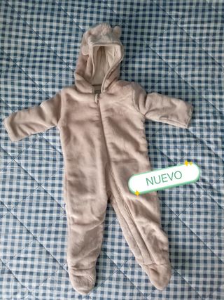 Mono de bebé de peluche suave, ideal para mantener a tu pequeño abrigado. Tiene un diseño con capucha y orejitas. - Talla: 9 a 12 meses. - Color: Beige o marrón muy claro. - Cierre frontal con cremallera. - Tejido muy suave. Comprado en El Corte Inglés, está sin usar.