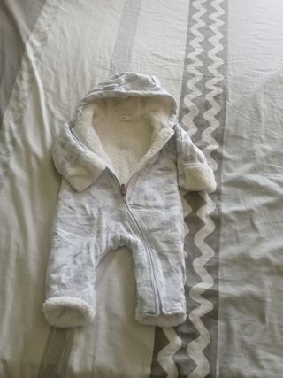Precioso buzo super abrigado para invierno. Talla 6m, 68 cm. Color gris perla con blanco. De manga larga con capucha con detalles de pelo blanco. Cierre central delantero con cremallera doble. Exterior textil con efecto acolchado. Delicados patucos que protegerán los pies de tu bebé extraibles para llevarlos con o sin ellos y manoplas para ponerle y proteger toda la manita o retirarlas y que lleven las manos al aire. Super completo y cómodo para que los recién nacidos vayan abrigados.