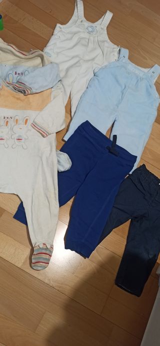 lote de ropa bebé 12 meses. pantalones Benetton azul marino forrado, pantalón chandal 2 pijamas buzo y 2 petos uno de pana blanco y otro azul bebé con forro