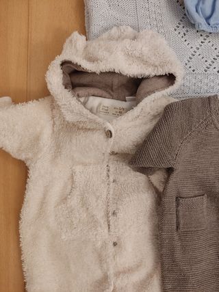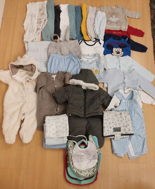 Lote bebe de 0 a 6 meses Mono buzo Zara de 1 a 3 meses Mono Gocco de 0 a 1 mes Mono buzo desmontable con manoplas Kiabi 1 mes Arrullo Zara 4 Bodies manga larga 10 palainas pantalones bebe 3 jerseys ( 2 Benetton y 1 Primark) 2 chaquetas punto de 3 a 6 meses 1 conjunto Dulces 1 a 3 meses 2 culottes o pantalones cortos 3 muselinas 1 cambiador 5 baberos ( 2 de suavinex, 1 hecho a mano)