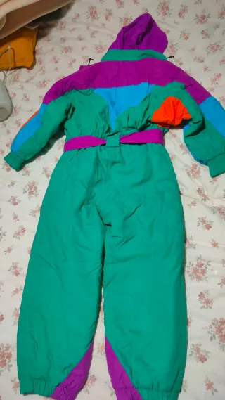 Precioso traje de nieve multicolor. Es de una tienda de esquí, super calentito. Con cremallera para facilitar el cambio, correas ajustables en las perneras para sujetar a las botas y corchetes el el gorro para poder quitarlo. Talla bastante grande y se puede usar hasta los 18 meses.
