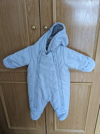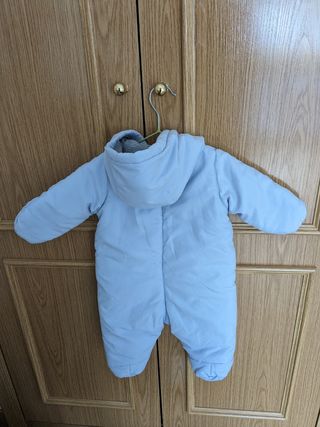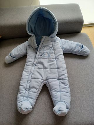 Buzo acolchado talla 3-6 meses. Con capucha de quita y pon. Cierres con automáticos en linea media y uniendo ambas perneras. Muy fácil de colocar poniendo al bebe sobre la prenda y luego cerrando automáticos. Ideal para llevar con mochila ergonómica o si no quieres llevar saco en el cuco o carro. Se uso únicamente unos meses y junto con otro.