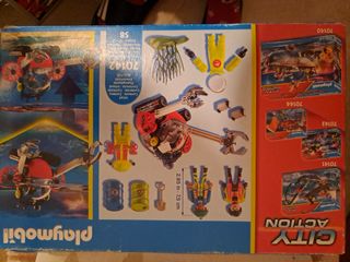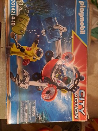 Set de Playmobil City Action, modelo 70142, con temática de submarino y exploración submarina. Incluye 58 piezas. - Vehículo submarino con cabina transparente. - Figura de buzo con traje amarillo. - Barriles y accesorios para la misión. - Advertencia de piezas pequeñas, no apto para menores de 3 años. -La caja se encuentra con evidentes signos de desgaste pero no el juguete.
