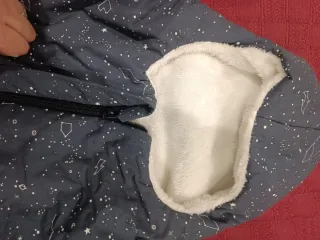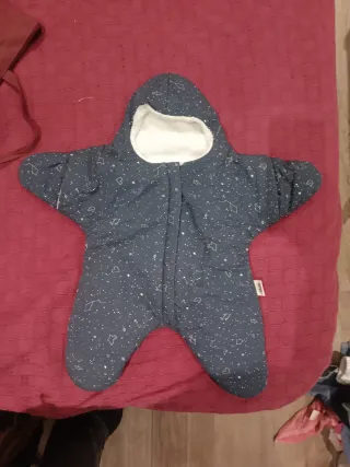 Saco buzo para bebé con diseño de estrellas y constelaciones. - Forma de estrella. - Capucha incorporada. - Cierre frontal con cremallera. - Interior forrado en blanco. Comprado en Galicia.