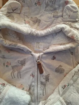 Buzo de bebé H&M con estampado de animalitos y flores. El tejido tiene algo de bolitas de los lavados. Mirar fotos. - Talla 68 (4-6 meses). - Interior de borreguillo muy suave. - Cierre de cremallera. - Capucha con orejitas.