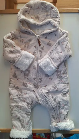 Abrigo acolchado para bebé con un adorable estampado de Bambi y flores. Perfecto para mantener a los más pequeños abrigados con estilo. Solo se ha usado 3 días, está como nuevo. - Diseño blanco con estampado de Bambi. - Capucha con orejitas. - Volantes decorativos en la parte delantera.