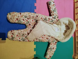 Buzo abrigado con estampado floral y forro interior suave. - Mono de Nieve - Edad: 3-6 meses - Manoplas desmontables con botones de presión - Zapatos extraíbles con botones - En perfecto estado