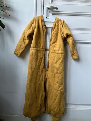 Mono tipo buzo para bebé, ideal para dormir o estar cómodo en casa. Diseño belga, adaptable a temporadas (invierno y otoño) y edades (mangas y pies adaptables para los que crecen). - Color amarillo mostaza. - Cierre de cremallera frontal. - Cremalleras para quitar mangas largas. - Tejido acolchado muy suave. - Los pies se pueden cerrar si el bebé es más pequeño.