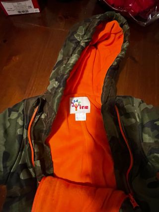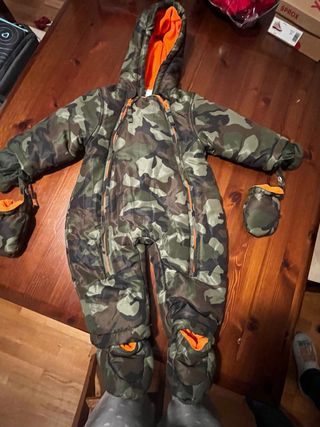 Buzo de invierno con estampado de camuflaje, ideal para los días más fríos. Incluye manoplas y cubrepiés. - Talla: 9-12 meses. - Forro interior naranja. - Cierre de cremallera frontal.