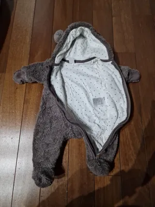 Buzo de invierno para bebés de 1 a 3 meses. Es un mono acolchado con capucha y manoplas. - Color gris jaspeado. - Forro interior blanco y suave. - Cierre frontal con cremallera. - Pies y puños elásticos.