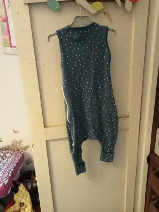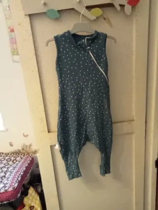 Buzo o bata-manta para dormir en verano, ideal para los más pequeños. Su diseño permite total libertad de movimiento. Se pueden tapar los pies. Talla 6-12 meses - Color azul marino con estampado de topos blancos. - Sin mangas. - Cremallera frontal.