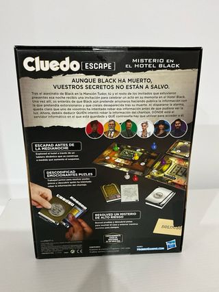 Juego de mesa Cluedo Escape, una aventura de misterio para un solo uso. - Serie de juegos de misterio. - Título: Misterio en el Hotel Black. - Edad recomendada: 10+ años. - Duración aproximada: 30 minutos. - Dificultad: 3 de 5. - Embalaje libre de plástico.