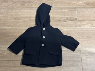 Abrigo infantil de color azul marino, con capucha y cierre de botones. - Diseño clásico. - Dos bolsillos frontales. - Botones plateados. Talla 12 meses. Marca: Del sur