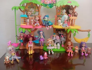 Set de muñecas Enchantimals con su casa árbol. - Incluye varias muñecas y figuras de animales. - La casa árbol tiene varios niveles y accesorios. - Ideal para coleccionistas y juego infantil.