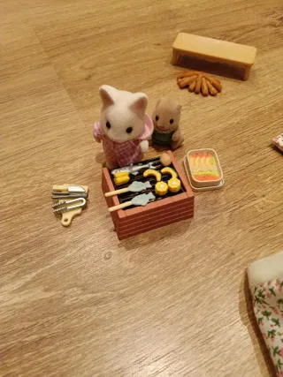 Conjunto de figuras de la familia Sylvanian con accesorios para acampar. - Tienda de campaña con diseño floral. - Figuras de animales. - Mesa de picnic. - Accesorios de comida y menaje.