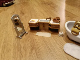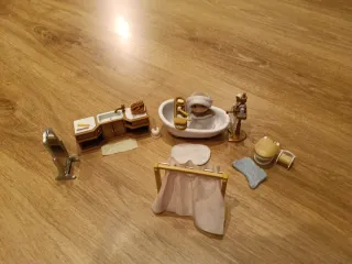 Conjunto de baño de Sylvanian Families. Incluye figuras y accesorios para crear escenas. - Bañera con figura. - Mueble de lavabo con espejo. - Inodoro y rollo de papel. - Accesorios de baño.
