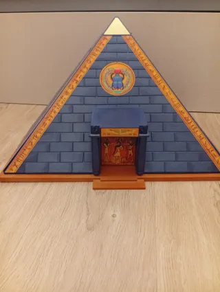 Pirámide temática del antiguo Egipto de Playmobil. Presenta un diseño detallado con jeroglíficos. - Fachada con puerta y figuras. - Símbolo del escarabajo en la parte superior. - Decoración inspirada en la cultura egipcia.