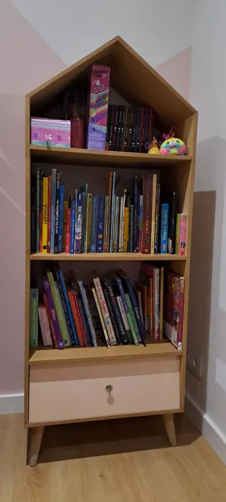 Estantería infantil con diseño de casa, ideal para organizar libros y juguetes. - Fabricada en madera. - Incluye un cajón inferior. - Patas de madera.