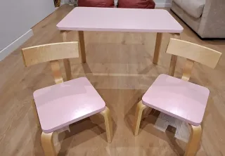 Conjunto de mobiliario infantil compuesto por una mesa y dos sillas. - Mesa con superficie rosa. - Sillas con asiento rosa. - Estructura de madera clara.