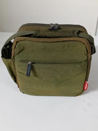 Bolsa tèrmica de la marca Valira, ideal para transportar comida. Incluye tuppers. Compartimento de malla en la tapa. Usada dos veces. Medidas : 24cm. alto. 13 cm. fondo y 26 cm. ancho. - Color verde y marrón. - Cierre de cremallera. - Correa ajustable para colgar.