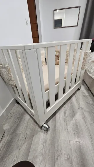 Minicuna Doco de Cotinfant en color blanco. Ideal para los primeros meses del bebé. Se puede usar como cuna individual o como colecho. - Medidas: 50x90 cm. 76cm de altura Incluye - Ruedas - Colchón - Cubrecolchon impermeable - 3 sábanas bajeras - Edredón y sabana bajera original de la cuna - Kit de colecho Tiene marcas de uso en dos esquinas muy sutiles está casi nueva. Vendo protector que se ve en la foto por 20eur mas (valorado en 49eur) Se entrega montada.