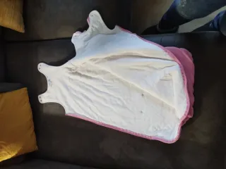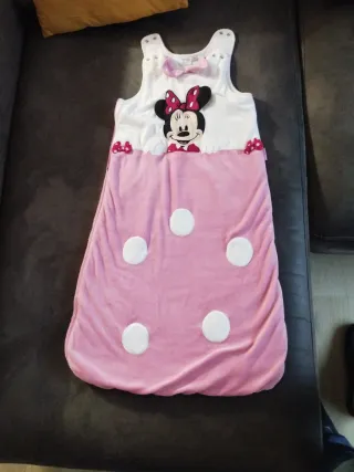 Saco de dormir para bebé con diseño de Minnie Mouse. - Color rosa con lunares blancos. - Estampado de Minnie Mouse en la parte superior. - Cierre con botones en los hombros.