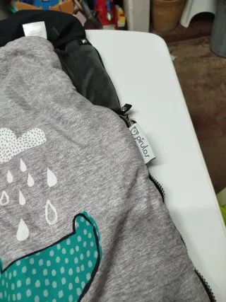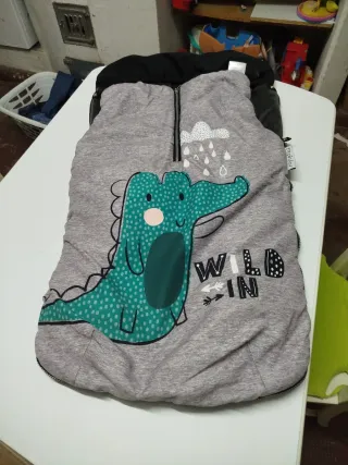 Saco para carrito de bebé con un divertido diseño de dinosaurio. - Estampado de dinosaurio verde. - Nubes y gotas de lluvia. - Texto WILD IN.