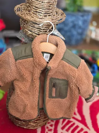 Chaqueta polar de la marca Gap para bebé de 6 meses. Es de color marrón con detalles en verde. - Material: forro polar. - Cierre de cremallera. - Bolsillo con cremallera en el pecho.