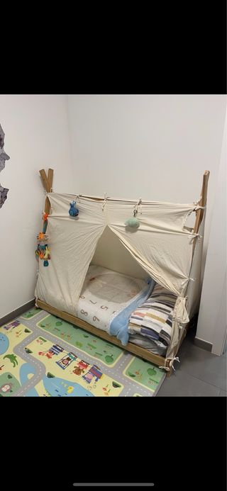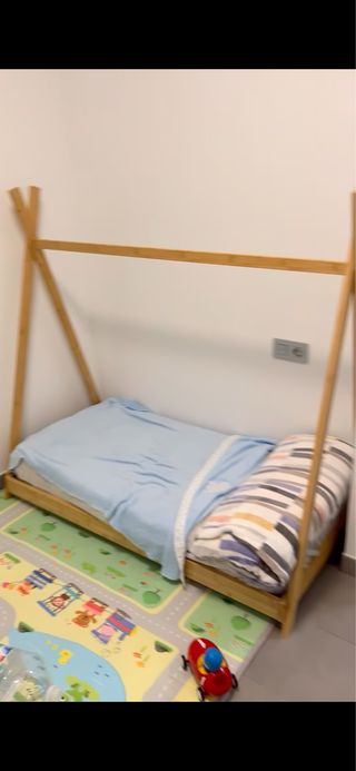 Cama tipi infantil de 70 × 140 cm, fabricada en madera natural, con colchón incluido. Su diseño es perfecto para crear un espacio de juego y descanso, ideal para la transición de cuna a cama. Incluye: - Estructura de cama tipi de madera natural - Somier de lamas - Colchón 70 × 140 cm Características: - Diseño tipo tipi, moderno y acogedor - Estructura baja, segura para niños pequeños - Madera natural, resistente y estable - Fácil montaje y desmontaje - Estilo Montessori Medidas: - Medida del colchón: 70 × 140 cm - Medidas exteriores aproximadas de la cama: 75 × 145 cm - Altura total del tipi: aprox. 120 cm Posibilidad de envío.