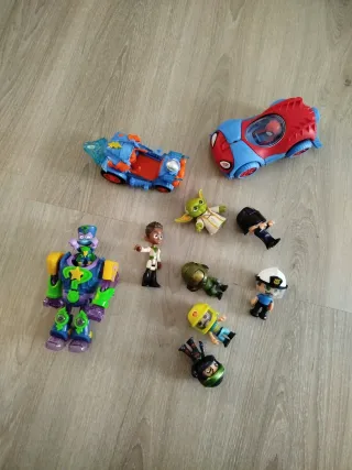 Conjunto de figuras de acción y coches de juguete. - Figura de robot morado y verde. - Coche de Spiderman rojo y azul. - Coche de carreras azul y naranja. - Figura de Yoda. - Figura de PJ Masks. - Figura de ninja. - Figura de policía. - Figura de piloto.