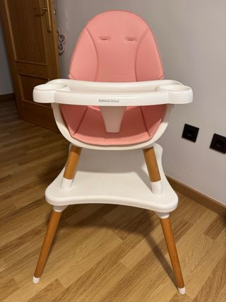 Trona Kikka Boo con diseño moderno y funcional. - Asiento acolchado en color rosa. - Bandeja extraíble. - Patas de madera.