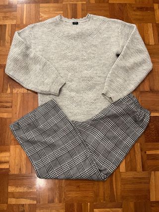 Conjunto de dos piezas para niña de 12 años, 152 cm - Jersey de punto gris con trenzado. - Pantalón ancho de cuadros príncipe de gales.