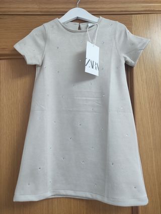 NUEVO CON ETIQUETA! Vestido de Zara para niña, talla 6 años. Un diseño bonito, con un tejido muy suave tipo terciopelo con brillantitos incrustados. Súper polivalente! Por su diseño y textura se podría usar para cualquier ocasión y en cualquier temporada: invierno, primavera, otoño, verano. - Color beige claro. - Adornado con pequeñas pedrerías. - Manga corta. - Cierre en la espalda. ocasiones especiales