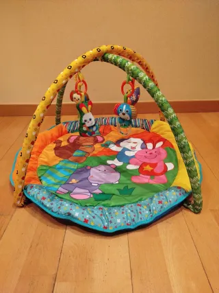 Manta de actividades para bebés con un diseño colorido y divertido: - Marca Juguettos. - Incluye arcos superiores desmontables con juguetes colgantes. - Medidas 90x90x50 cm. - A partir de 0 meses. - Ilustraciones de animales.