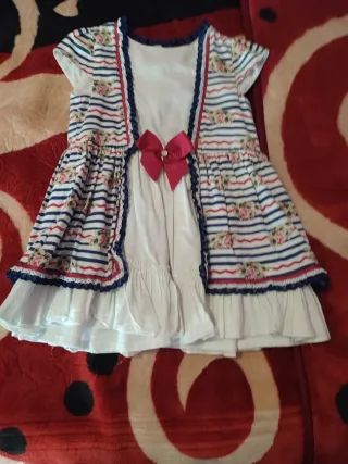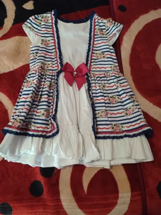 Vestido infantil de la marca Miranda, talla 5. Presenta un diseño alegre con rayas marineras y flores. - Estampado de rayas azules y rojas con motivos florales. - Detalle de lazo fucsia en la parte delantera. - Volantes en el bajo.