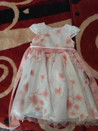 Vestido de fiesta blanco con detalles florales en rosa. - Diseño de la marca Fanny Look Paris. - Talla 4. - Tejido ligero y vaporoso. - Cinturón de satén rosa. - Adornos florales bordados.