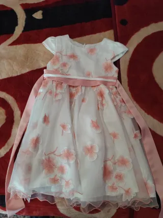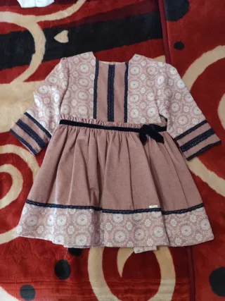 Vestido de la marca Miranda en talla 5. Precioso diseño con detalles. - Color rosa palo. - Estampado floral blanco en mangas y bajo. - Lazos de terciopelo negro en cintura y mangas. - Ribete de encaje azul marino.