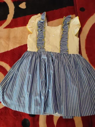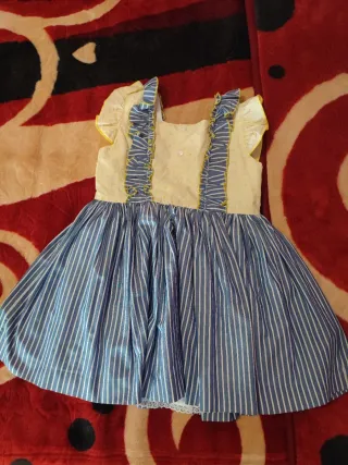 Vestido infantil de la marca LPP en talla 6. Presenta un diseño con la parte superior en amarillo con pequeños topos y volantes azules con ribete amarillo, y una falda de rayas azules y blancas. - Parte superior amarilla con topos. - Volantes decorativos en los tirantes. - Falda a rayas azules y blancas.