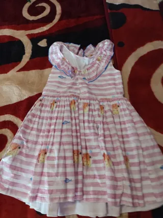 Vestido infantil de la marca Lili Lu en talla 10. Presenta un diseño alegre con rayas rosas y blancas, adornado con simpáticos peces. - Diseño a rayas rosas y blancas. - Estampado de peces. - Cuello con volantes y ribete azul.