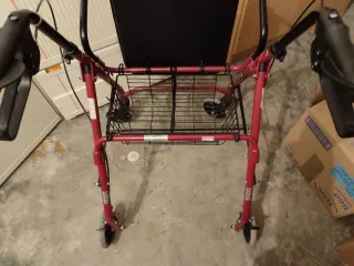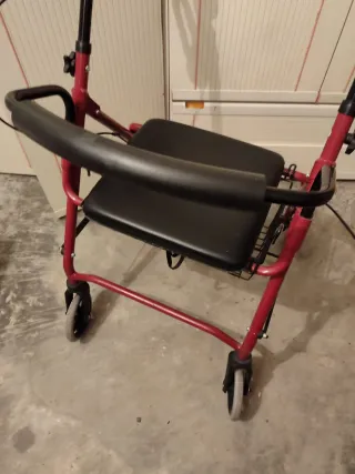Andador ligero y práctico para personas mayores, diseñado para ofrecer apoyo y comodidad. - Estructura de color rojo. - Asiento negro. - Ruedas para facilitar el desplazamiento.